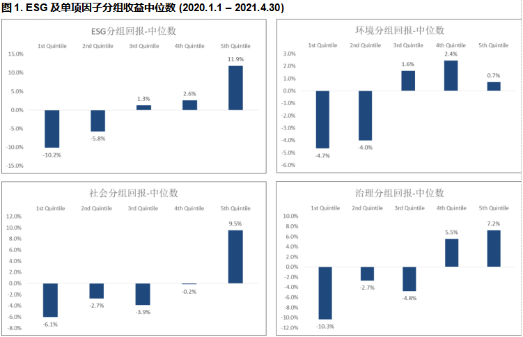 萬得全A指數在2020年1月1日至2021年4月30日之間上漲了24.55%。同期我們看到,ESG評分與回報持續呈現較強的正相關關系,這也與我們之前的測試結果一致。其中ESG評分最高的第5組回報中位數高于分數最低的第1組22.1%,這證實了ESG領先者在短期市場低迷時期跑贏大市以及之后更強的股價回彈的能力。