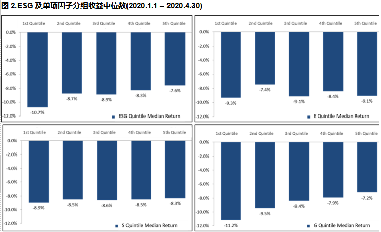 我們2020年1-4月觀察結果僅顯示了G因子有較強區分效果和一致性(圖2),而此次延長觀察期到今年4月后,我們看到E、S和G三個單項因子普遍呈現高的相關性,且其中S和G因子一致性和效果最佳。S和G最高分組在回報中位數方面分別高于最低分組15.6%和17.5%(圖1)。這表明,后疫情時期市場持續為對治理和社會表現優異的公司提供溢價。我們認為這些S和G 的因素,特別是管理和領導力、突發事件應對能力、業務持續性計劃、員工福利、健康安全、社會支援等,都有助于公司在面臨大規模公共衛生危機時更快的恢復經營甚至將危機轉化成業務機遇,提升競爭力。這一結果也進一步證實治理因素一直是A股市場影響企業質量和財務表現的核心要素之一,也是市場一直以來的共識。我們留意到,治理因子的超額回報主要來自于最低分組的弱勢,這表明治理因子可能在識別落后者方面比辨識領導者更加有效。