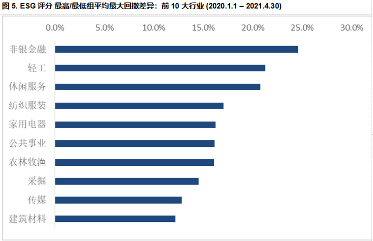 我們觀察到,在28個申萬一級行業中的24個中, ESG行業領先者(ESG評分最高20%組)都在一定程度上跑贏了落后者,ESG行業領先者優勢最大的前十大行業中,平均收益的優勢在28.4%到85.2%之間,其中分度最明顯的是電氣設備,建筑材料,輕工行業和食品飲料,如圖4所示。