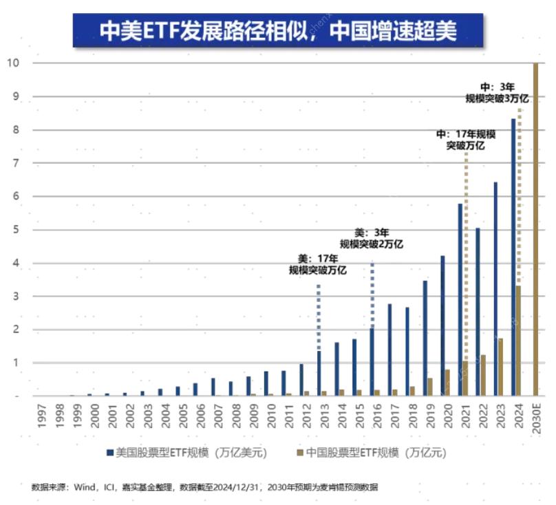以權益類ETF為例,美國市場用17年突破萬億規模,又用了3年破第二個萬億,截至2024年末,美國ETF市場規模高達8萬億美元。中國市場同樣用17年實現首個萬億,但僅用3年便突破三萬億,增速遠超美國,發展勢頭迅猛,背后是多重因素合力推動。