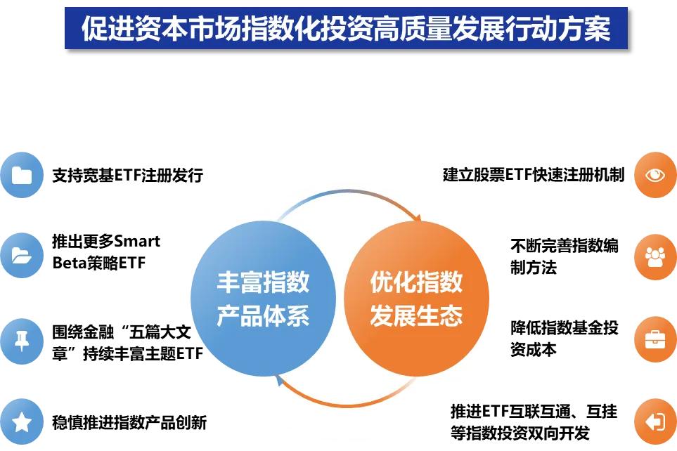 新“國九條”提出,大力發展權益類公募基金,大幅提升權益類基金占比,建立交易型開放式指數基金(ETF)快速審批通道,推動指數化投資發展。