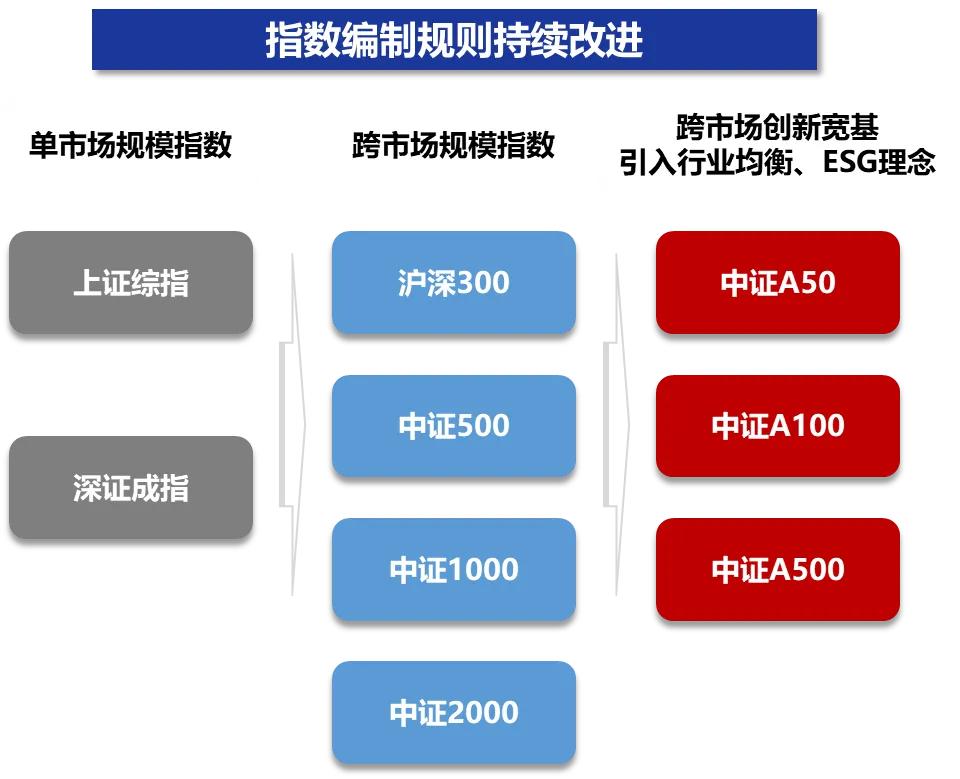 從最早的上證、深證單市場綜合指數,到以滬深300、中證500為代表的規模寬基指數,實現了對A股資產市值結構的全面表征,再到中證A500為核心的A系列創新寬基指數,精選細分行業龍頭、兼顧行業均衡,并且引入國際先進的ESG投資理念,指數的表征性和深度投資價值進一步提升。