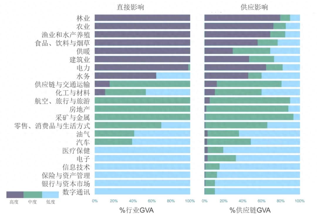 世界經濟論壇研究顯示,盡管部分行業并沒有直接面臨自然損失風險,例如化工與材料、航空、旅行與旅游、房地產、采礦與金屬、供應鏈和交通運輸及零售、消費品與生活方式六個行業的總增加值(Gross Value Added, GVA)對自然的直接依賴度低于15%,但其供應鏈環節中超過50%的GVA對自然存在中度或高度或依賴(如圖1)。