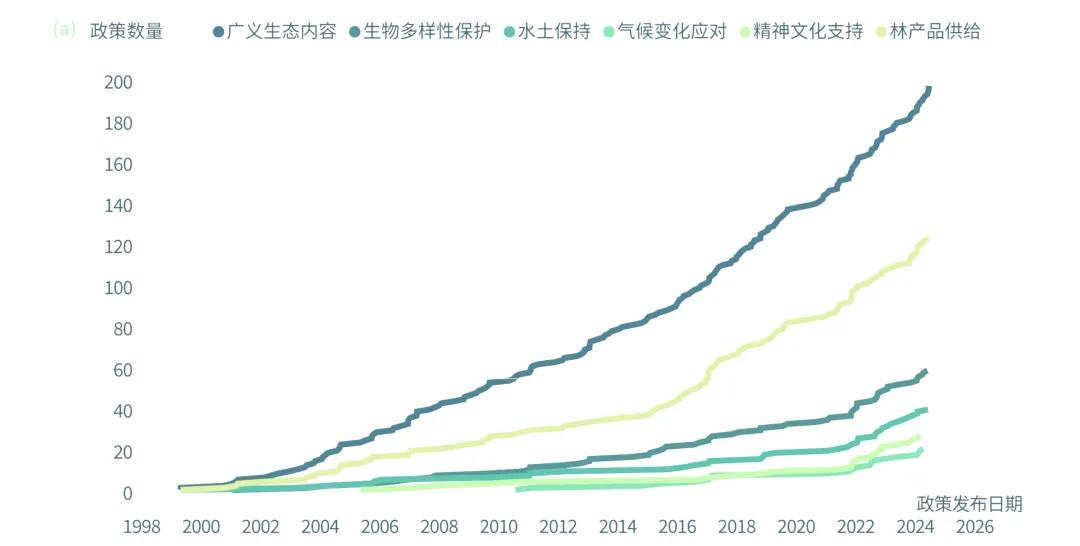與此同時,中國國內推動森林修復與生態系統保護的政策法規體系也在持續完善與強化。從自上世紀90年代以來頒布的296項相關政策文件中發現,與森林修復相關的國家級政策法規體系持續演化與發展,且2014年后顯著加速,部門協同的程度也在逐步加深[5]。