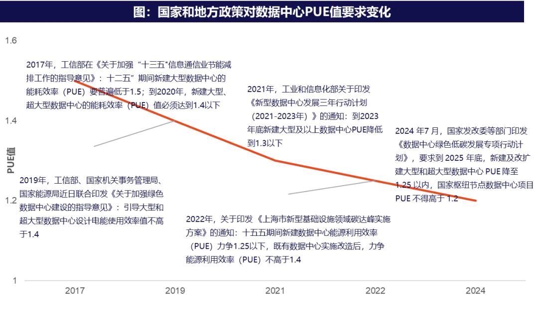 用電側的節能提效是數據中心低碳轉型的首要抓手,而降低電能利用效率(PUE)是短期內最直接的路徑。PUE是數據中心總能耗與IT設備能耗的比值,數值越接近1,能效越高。政策層面已明確對 PUE 的硬性約束:北京、上海、廣東等算力熱點地區此前出臺數據中心建設及升級改造要求,其中北京要求新建數據中心PUE準入值達到1.2,上海規定新建數據中心PUE不高于1.25。這一政策導向下,能效偏低的項目正逐步被淘汰,高能效數據中心在行業準入與運營成本上的優勢愈發顯著。